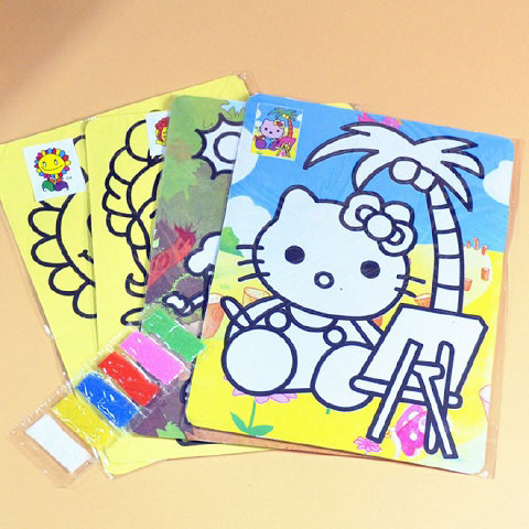 儿童沙画,顾名思义,就是小孩子玩的那种用彩色沙子或者彩色墨水,在有图形轮廓的纸片上去绘画,可以按照儿童沙画底板上的人物轮廓线条,动物线条,风景线条,动漫线条,去添加自己喜欢的颜色,让单调的线条变成自己最喜欢的颜色的画。儿童沙画可以提高孩子们的动手能力,想像力,能发挥他们的创造力,丰富孩子们的知识。